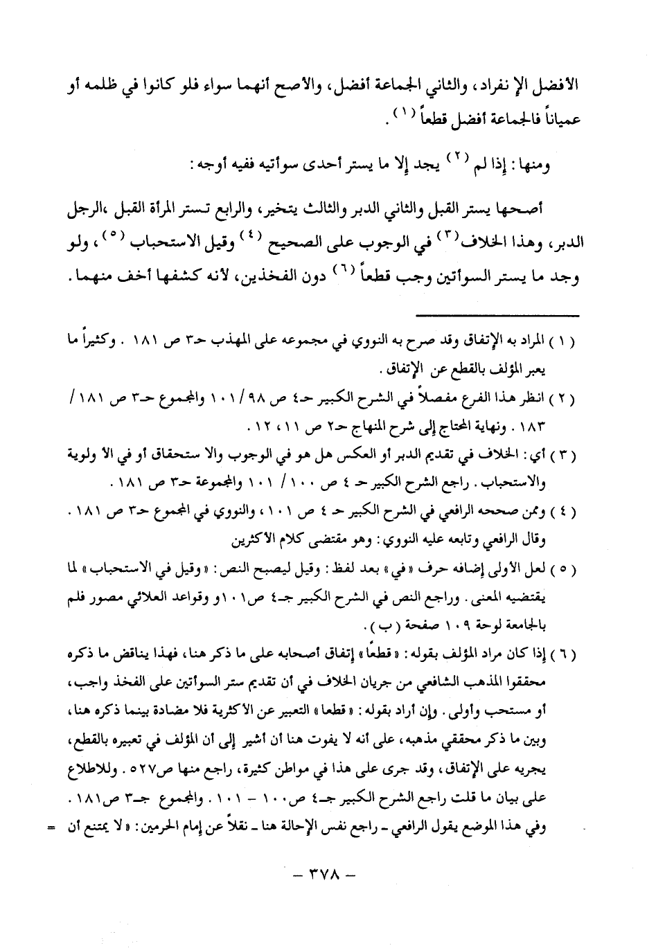 (¬6) إِذا كان مراد المؤلف بقوله: "قطعًا" إِتفاق أصحابه على ما ذكر هنا، فهذا يناقض ما ذكره محققوا المذهب الشافعي من جريان الخلاف في أن تقديم ستر السوأتين على الفخذ واجب، أو مستحب وأولى. وإن أراد بقوله: "قطعا" التعبير عن الأكثرية فلا مضادة بينما ذكره هنا، وبين ما ذكر محققي مذهبه، على أنه لا يفوت هنا أن أشير إِلى أن المؤلف في تعبيره بالقطع، يجريه على الاتفاق، وقد جرى على هذا في مواطن كثيرة، راجع منها ص 527. وللاطلاع على بيان ما قلت راجع الشرح الكبير جـ 4 ص 100 - 101. والمجموع جـ 3 ص 181. وفي هذا الموضع يقول الرافعى -راجع نفس الإحالة هنا- نقلًا عن إِمام الحرمين: "لا يمتنع أن =