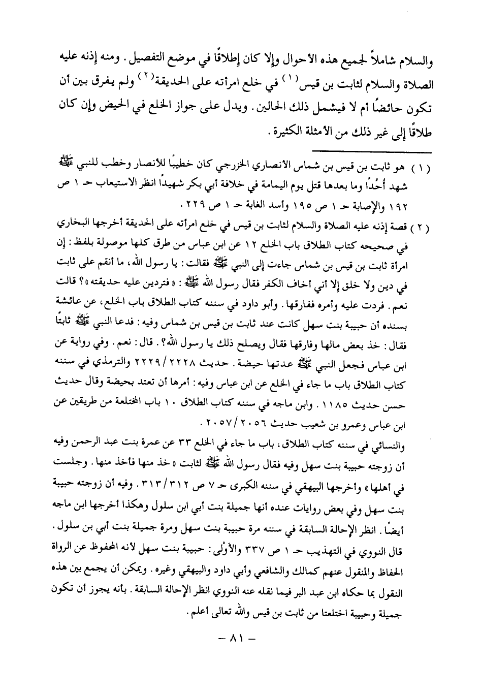 (¬2) قصة إذنه عليه الصلاة والسلام لثابت بن قيس في خلع امرأته على الحديقة أخرجها البخارى في صحيحه كتاب الطلاق باب الخلع 12 عن ابن عباس من طرق كلها موصولة بلفظ: إن امرأة ثابت بن قيس بن شماس جاءت إِلى النبي - صلى الله عليه وسلم - فقالت: يا رسول الله، ما أنقم على ثابت في دين ولا خلق إلا أني أخاف الكفر فقال رسول الله - صلى الله عليه وسلم -: "فتردين عليه حديقته"؟ قالت نعم. فردت عليه وأمره ففارقها. وأبو داود في سننه كتاب الطلاق باب الخلع، عن عائشة بسنده أن حبيبة بنت سهل كانت عند ثابت بن قيس بن شماس وفيه: فدعا النبي - صلى الله عليه وسلم - ثابتًا فقال: خذ بعض مالها وفارقها فقال ويصلح ذلك يا رسول الله؟. قال: نعم. وفي رواية عن ابن عباس فجعل النبى - صلى الله عليه وسلم - عدتها حيضة. حديث 2229/ 2228 والترمذي في سننه كتاب الطلاق باب ما جاء في الخلع عن ابن عباس وفيه: أمرها أن تعتد بحيضة وقال حديث حسن حديث 1185. وابن ماجه في سننه كتاب الطلاق 10 باب المختلعة من طريقين عن ابن عباس وعمرو بن شعيب حديث 2056/ 2057.