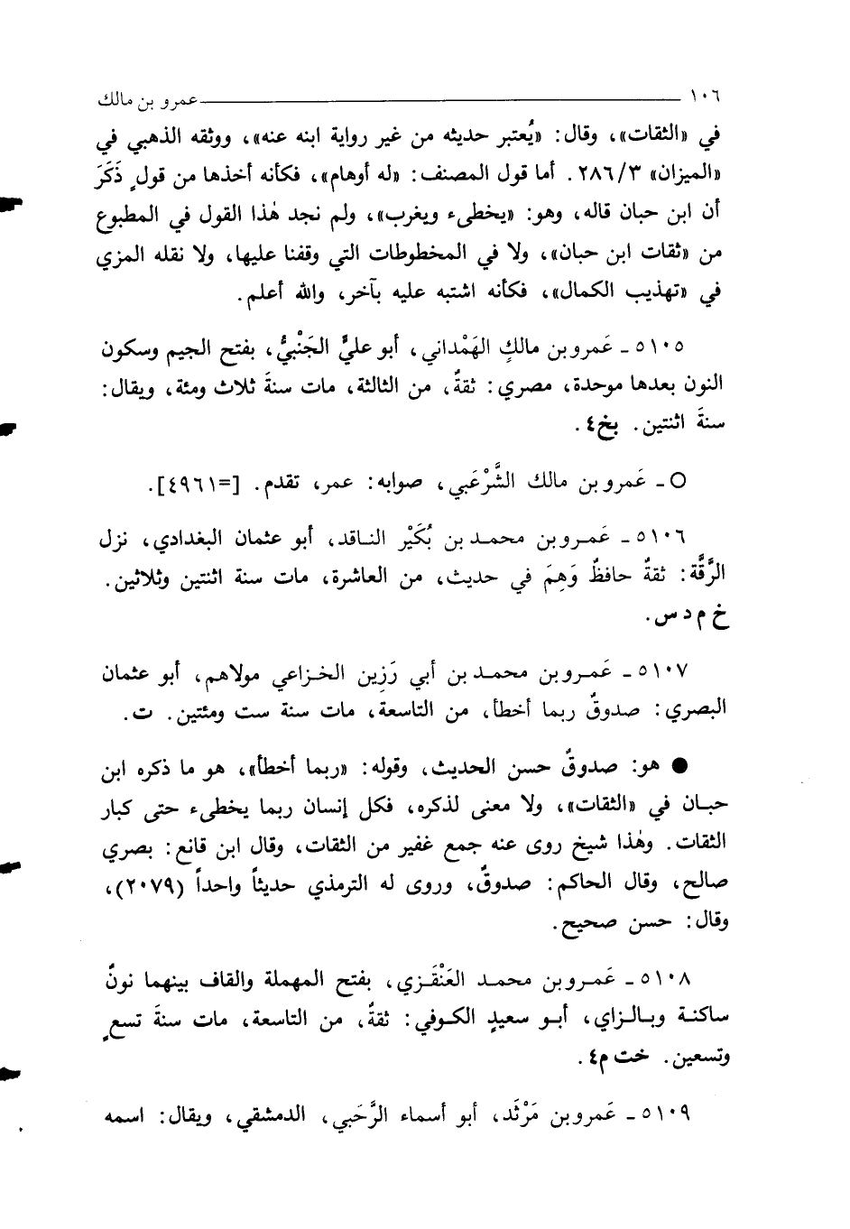 5106 - عَمرو بن محمد بن بُكَيْر الناقد، أبو عثمان البغدادي، نزل الرَّقَّة: ثقةٌ حافظٌ وَهِمَ في حديث، من العاشرة، مات سنة اثنتين وثلاثين. خ م د س.