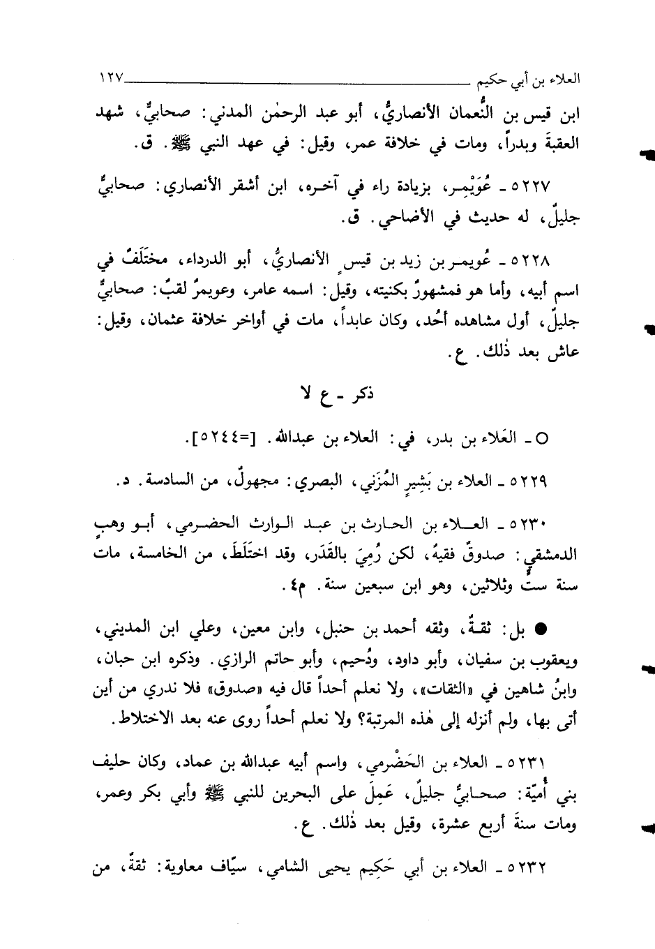 5227 - عُوَيمِر، بزيادة راء في آخره، ابن أشقر الأنصاري: صحابي جليلٌ، له حديث في الأضاحي. ق.