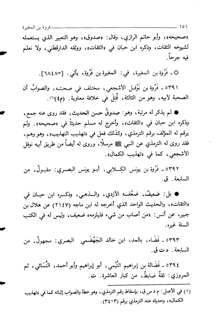 5391 - فَرْوة بن نَوْفل الأشجعي، مختلف في صحبته، والصوابُ أن الصحبة لأبيه، وهو من الثالثة، قُتِلَ في خلافة معاوية. (م 4) (¬1).