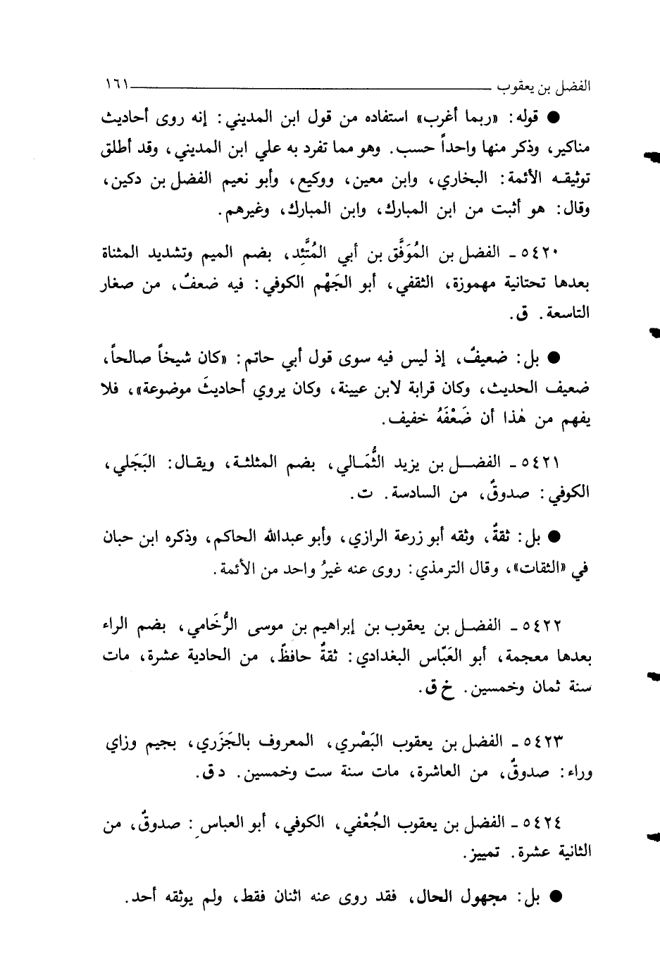 5424 - الفضل بن يعقوب الجُعْفي، الكوفي، أبو العباسِ: صدوقٌ، من الثانية عشرة. تمييز.