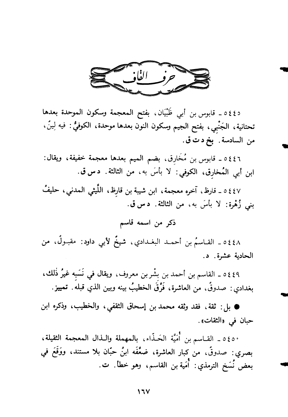 5449 - القاسم بن أحمد بن بشْر بن معروف، ويقال في نَسَبه غيرُ ذلك، بغدادي: صدوقٌ، من العاشرة، فَرَّقَ الخطيبُ بينه وبين الذي قبلهَ. تمييز.