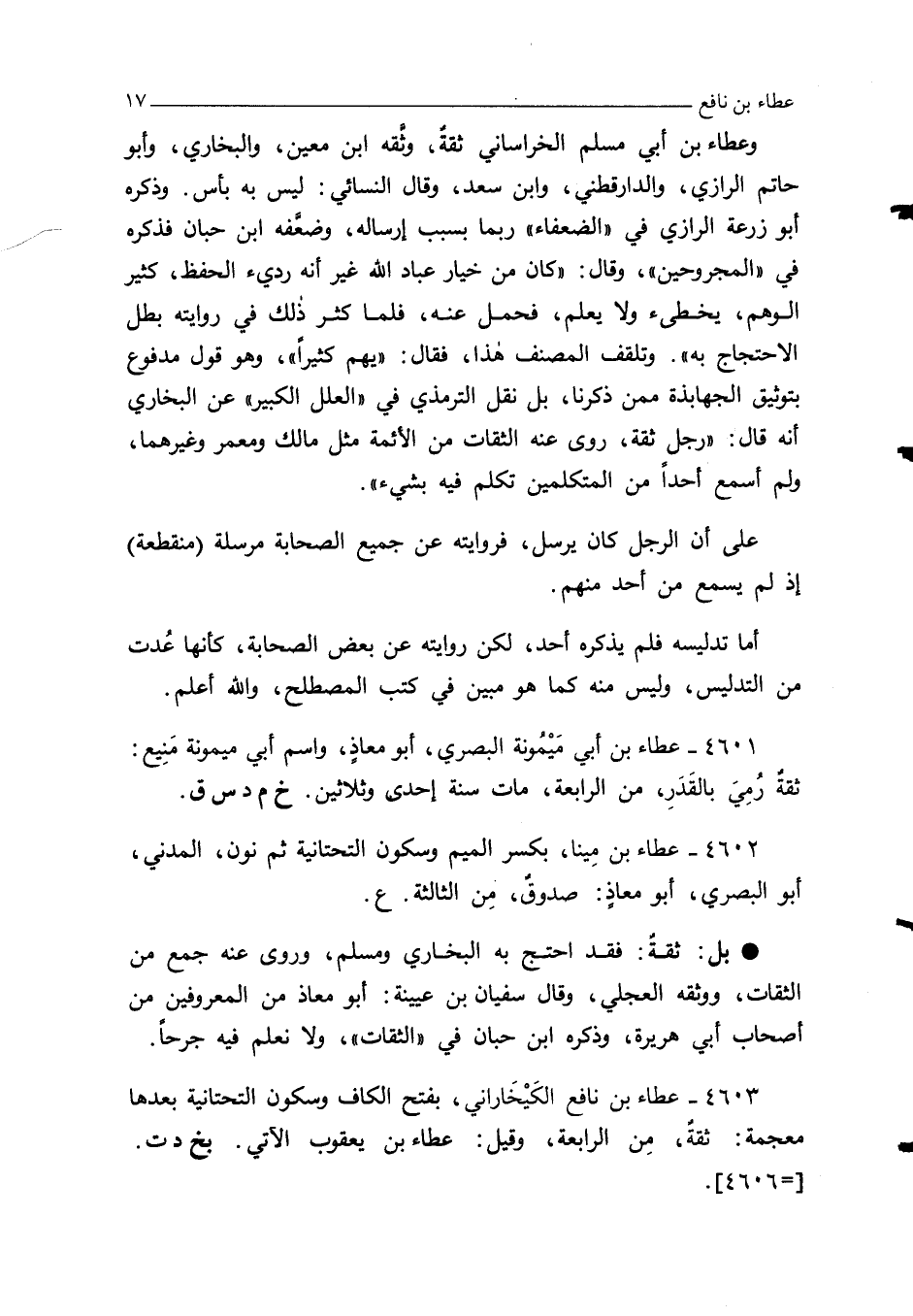 4603 - عطاء بن نافع الكَيْخَاراني، بفتح الكاف وسكون التحتانية بعدها معجمة: ثقةٌ، مِن الرابعة، وقيل: عطاء بن يعقوب الآتي. بخ د ت. [=4606].