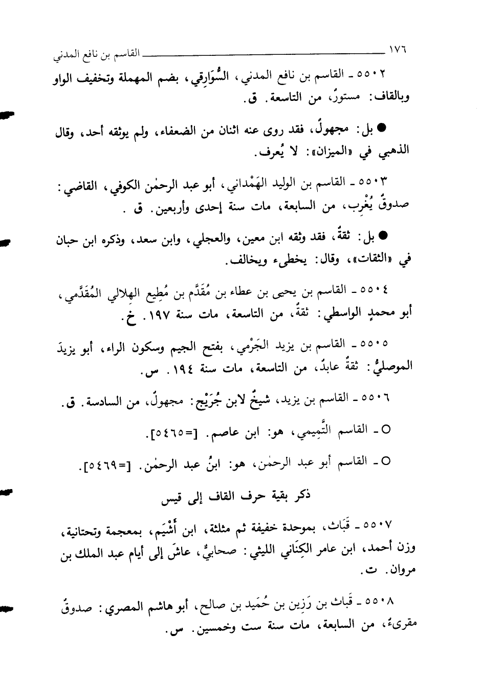 5502 - القاسم بن نافع المدني، السُّوَارِقي، بضم المهملة وتخفيف الواو وبالقاف: مستورٌ، من التاسعة. ق.