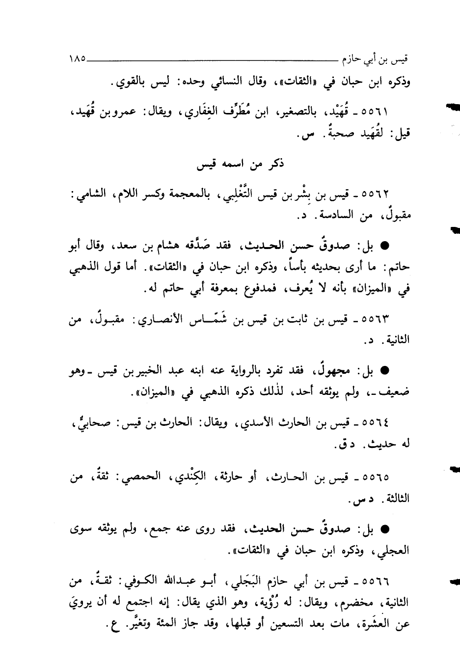 5566 - قيس بن أبي حازم البَجَلي" أبو عبد الله الكوفي: ثقةٌ، من الثانية، مخضرم، ويقال: له رُؤْية، وهو الذي يقال: إنه اجتمع له أن يرويَ عن العشَرة، مات بعد التسعين أو قبلها، وقد جاز المئة وتغيَّر. ع.