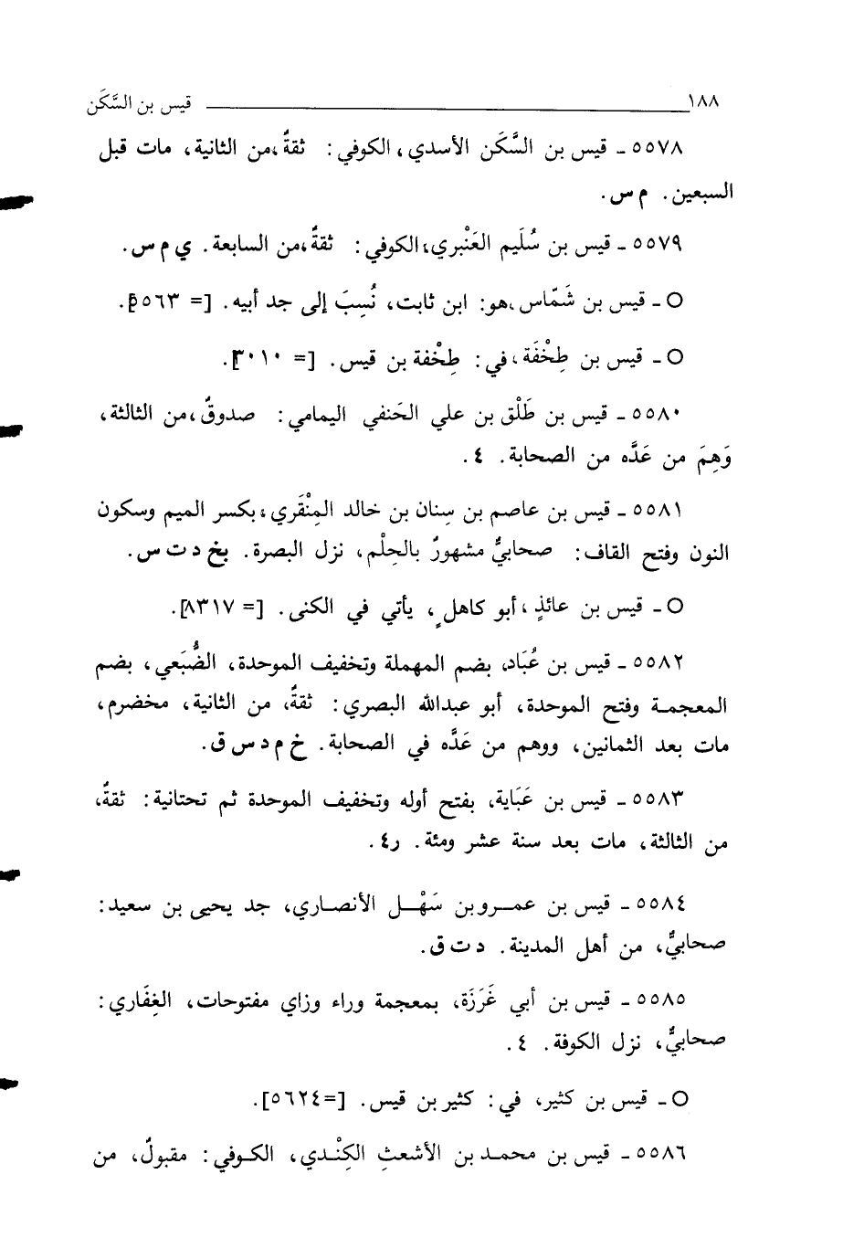 5578 - قيس بن السَّكَن الأسدي، الكوفي؛ ثقةٌ، من الثانية، مات قبل السبعين. م س.