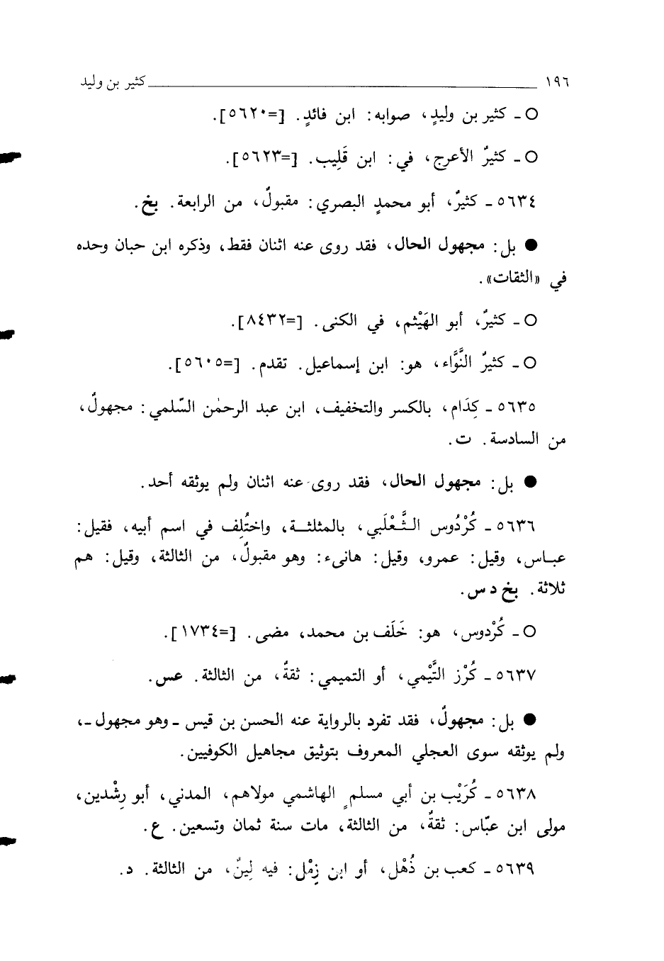 5636 - كُرْدُوس الثعْلَبي، بالمثلثة، واختُلِف في اسم أبيه، فقيل: عباس، وقيل: عمرو، وقيل: هانئ: وهو مقبولٌ، من الثالثة، وقيل: هم ثلاثة. بخ د س.