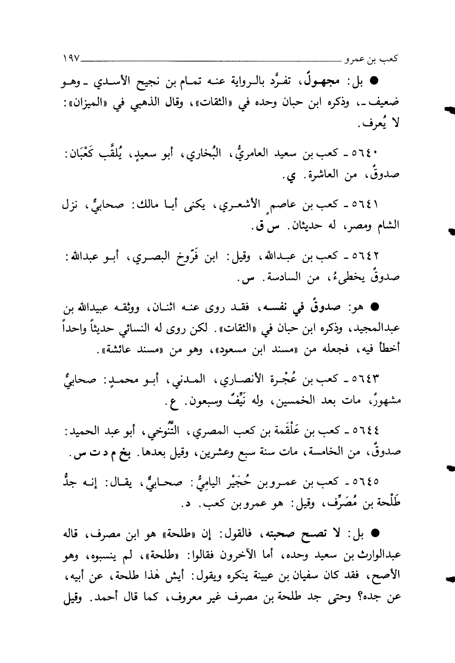 5645 - كعب بن عمرو بن حُجَيْر اليامِيُّ: صحابي، يقال: إنه جدُّ طَلْحة بن مُصَرّف، وقيل: هو عمرو بن كعب. د.