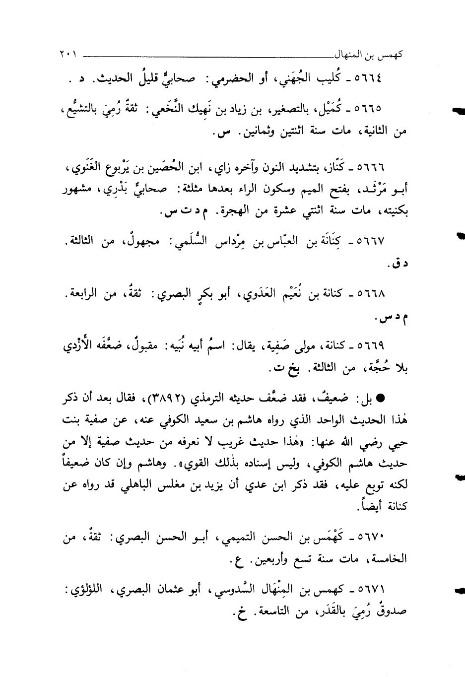 5671 - كهمس بن المِنْهَال السَّدوسي، أبو عثمان البصري، اللؤلؤي: صدوقٌ رُمِيَ بالقَدَر، من التاسعة. خ.