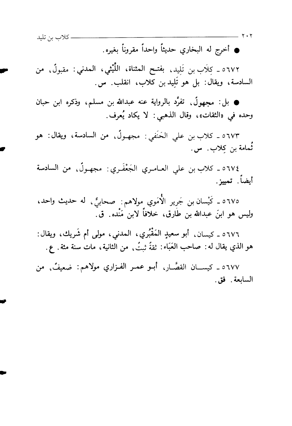 5673 - كلاب بن علي الحَنَفي: مجهولٌ، من السادسة، ويقال: هو ثُمامة بن كِلاب. س.