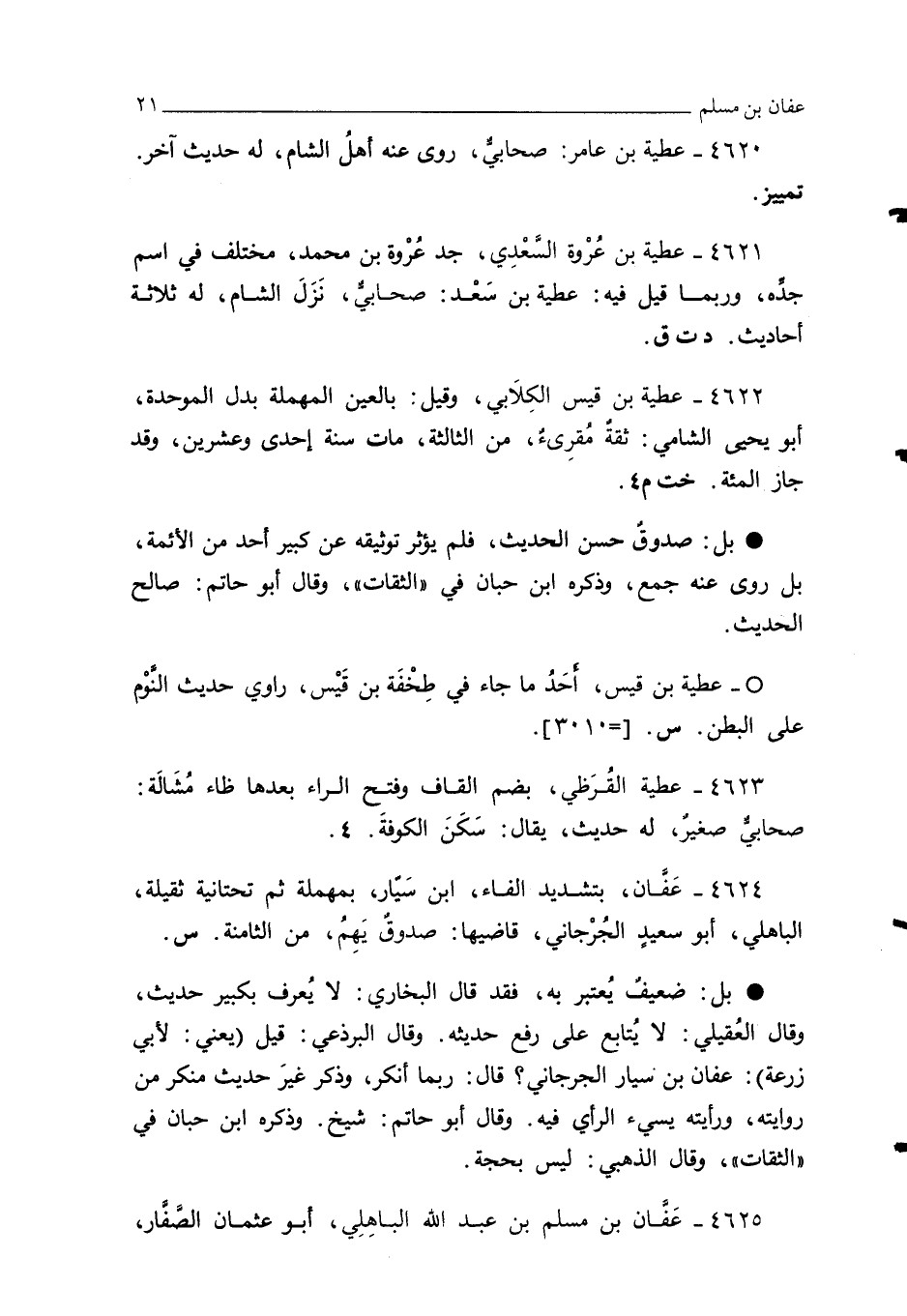 4624 - عَفَّان، بتشديد الفاء، ابن سَيَّار، بمهملة ثم تحتانية ثقيلة، الباهلي، أبو سعيدٍ الجُرْجاني، قاضيها: صدوقٌ يَهِمُ، من الثامنة. س.