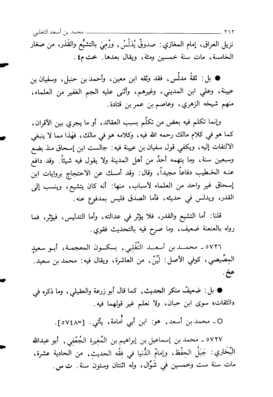 5726 - محمد بن أسعد التَغْلِبي، بسكون المعجمة، أبو سعيدٍ المِصِّيصي، كوفي الأصل: لَيِّنٌ، من العاشرة، ويقال فيه: محمد بن سعيد.