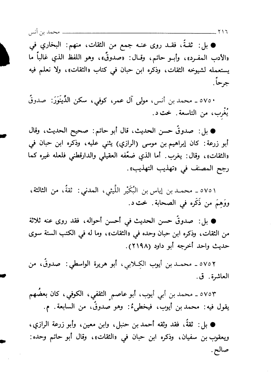 5750 - محمد بن أنس، مولى آل عمر، كوفي، سكن الدِّينَوَرَ: صدوقٌ يُغْرِب، من التاسعة. خت د.