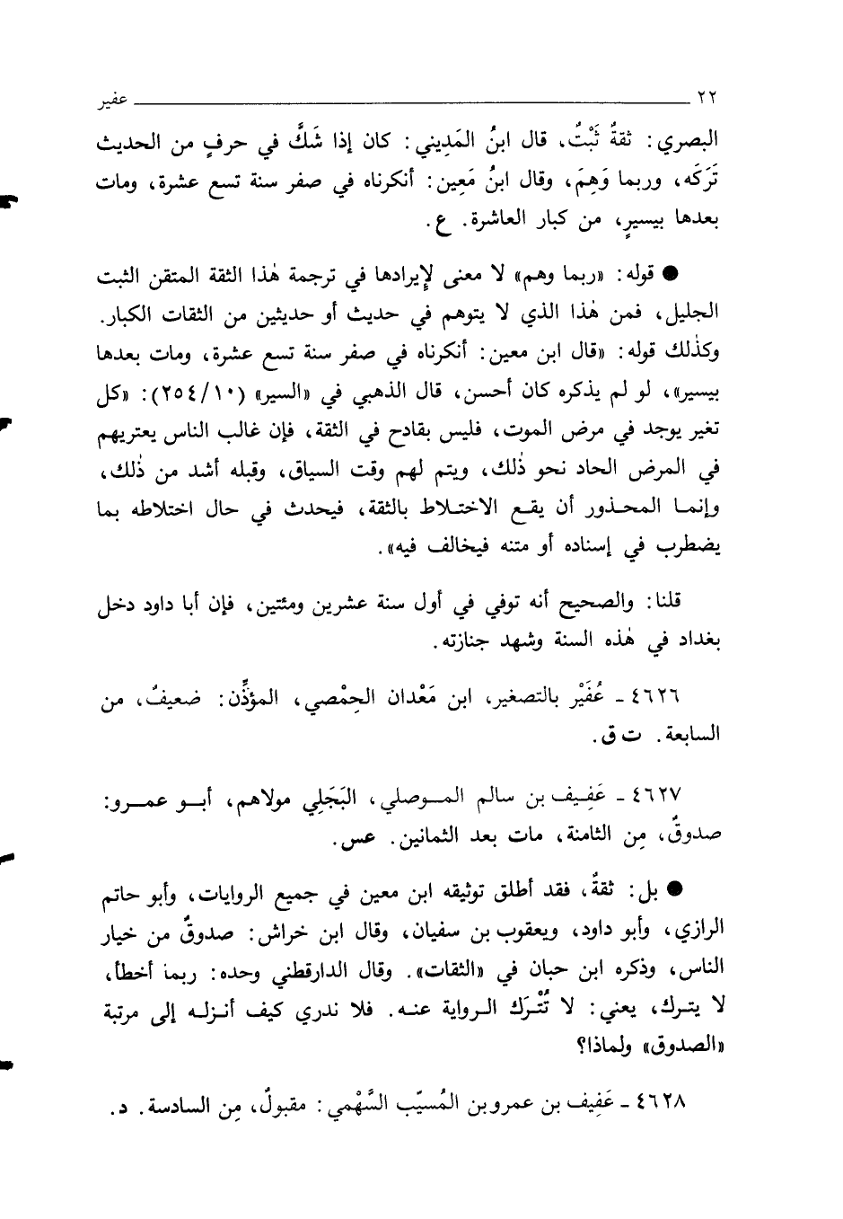 4627 - عَفِيف بن سالم الموصلي، البَجَلِي مولاهم، أبو عمرو: صدوقٌ، مِن الثامنة، مات بعد الثمانين. عس.