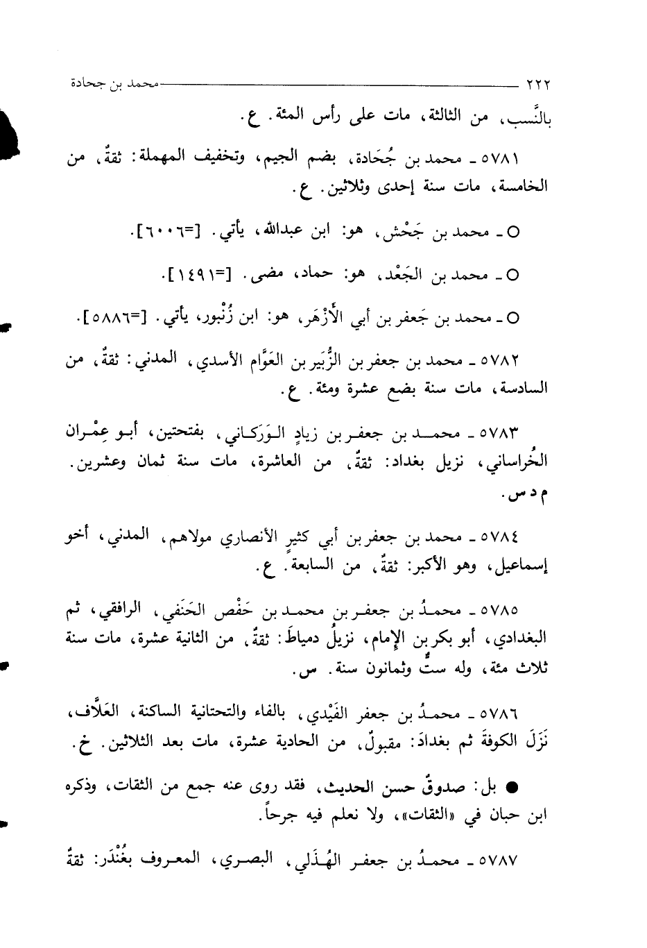 5781 - محمد بن جُحَادة، بضم الجيم، وتخفيف المهملة: ثقةٌ، من الخامسة، مات سنة إحدى وثلاثين. ع.