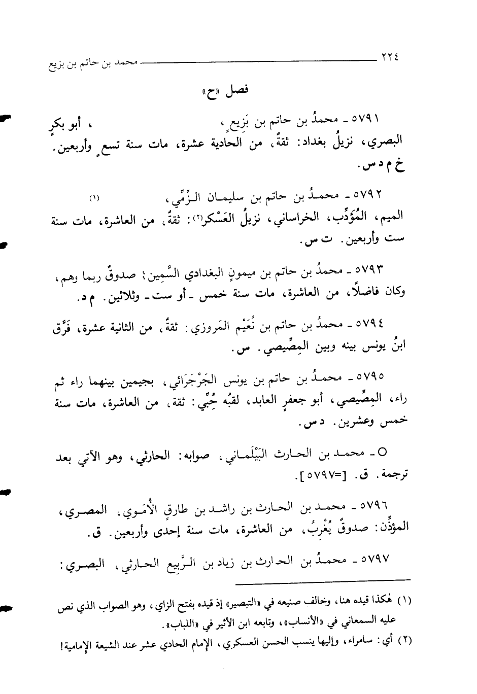 5793 - محمدُ بن حاتم بن ميمونٍ البغدادي السَّمِين: صدوقٌ ربما وهم، وكان فاضلًا، من العاشرة، مات سنة خمس - أو ست - وثلاثين. م د.