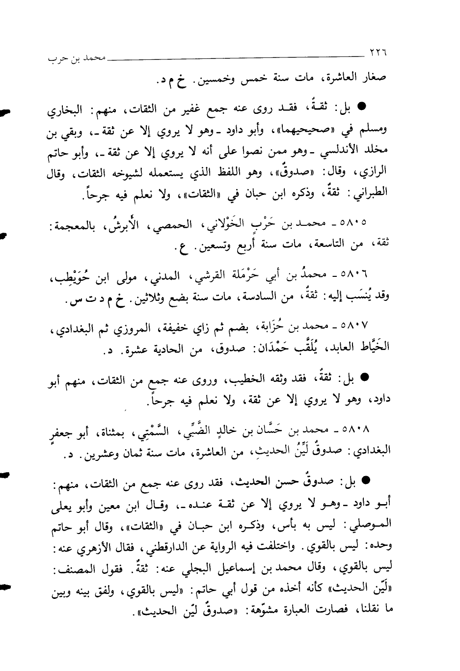 5805 - محمد بن حَرْبٍ الخَوْلاني، الحمصي، الأَبرشُ، بالمعجمة: ثقةٌ، من التاسعة، مات سنة أَربع وتسعين. ع.
