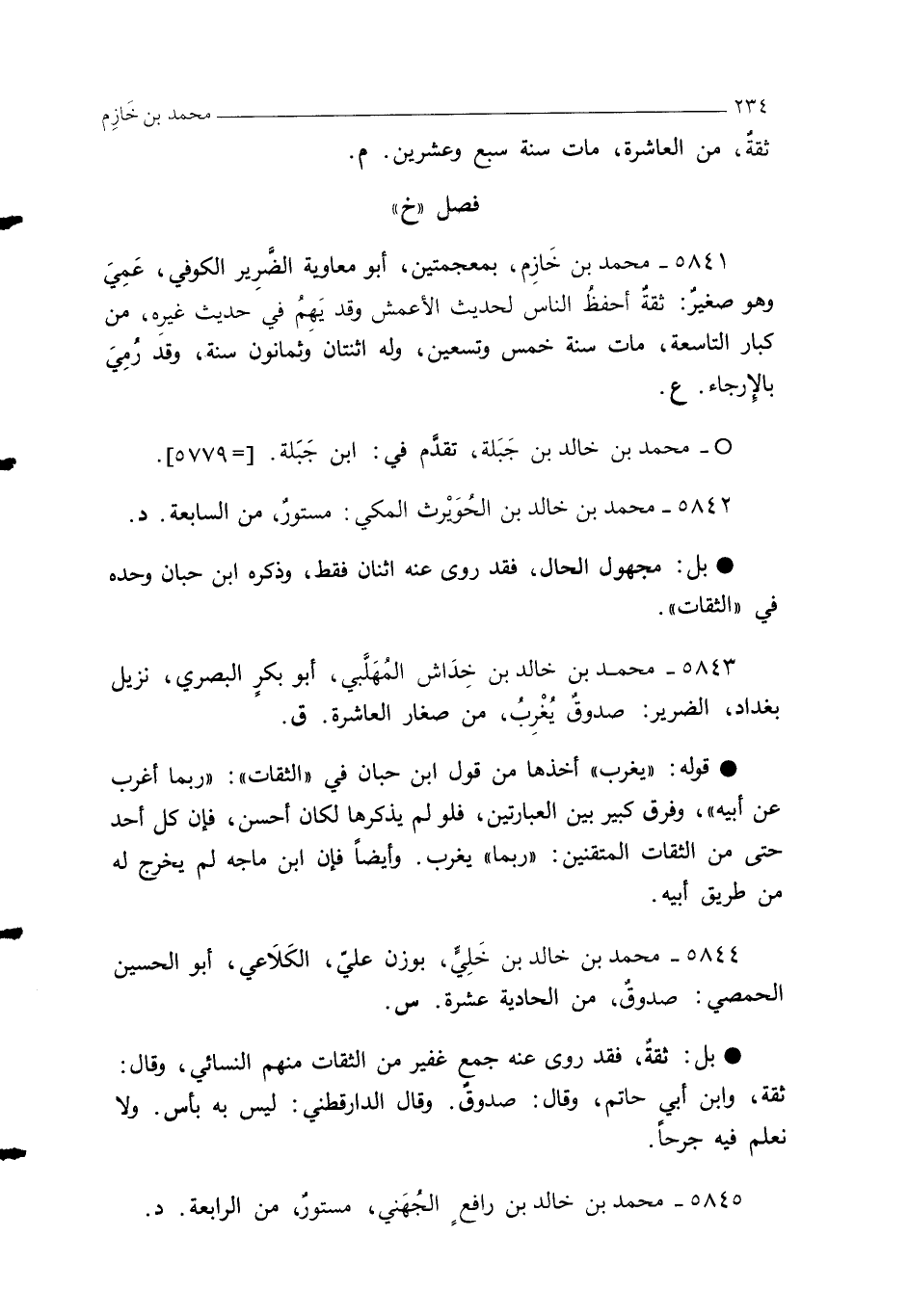 5844 - محمد بن خالد بن خَلِيٍّ، بوزن عليّ، الكَلَاعي، أبو الحسين الحمصي: صدوقٌ، من الحادية عشرة. س.
