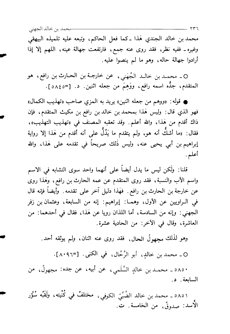 5851 - محمد بن خالد الضَّبِّيّ الكوفي، مختلفٌ في كُنْيته، ولَقَبُه سُؤْر الأَسد: صدوقٌ، من الخامسة. ت.
