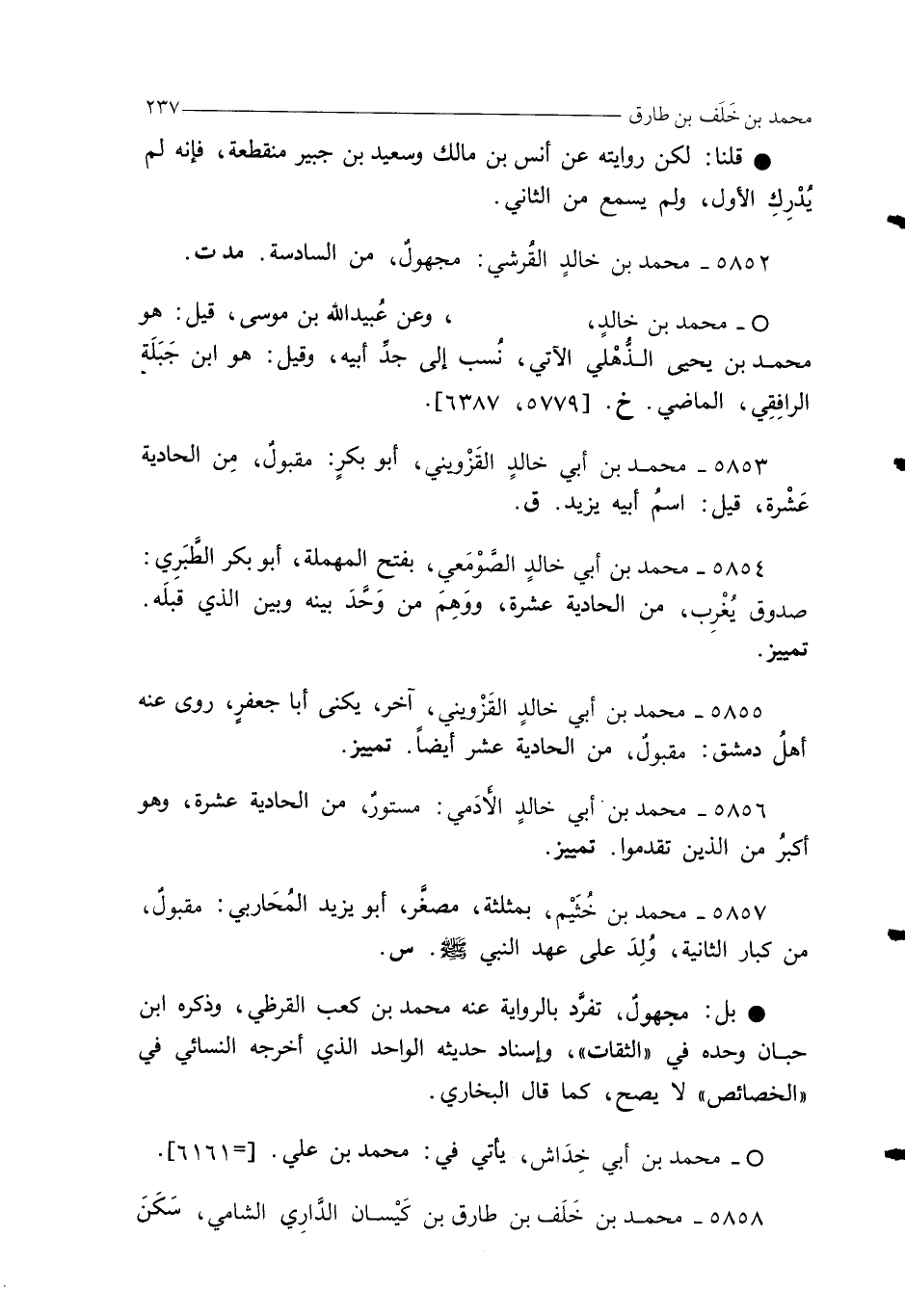 5856 - محمد بنْ أبي خالدٍ الأَدَمي: مستورٌ، من الحادية عشرة، وهو أكبرُ من الذين تقدموا. تمييز.