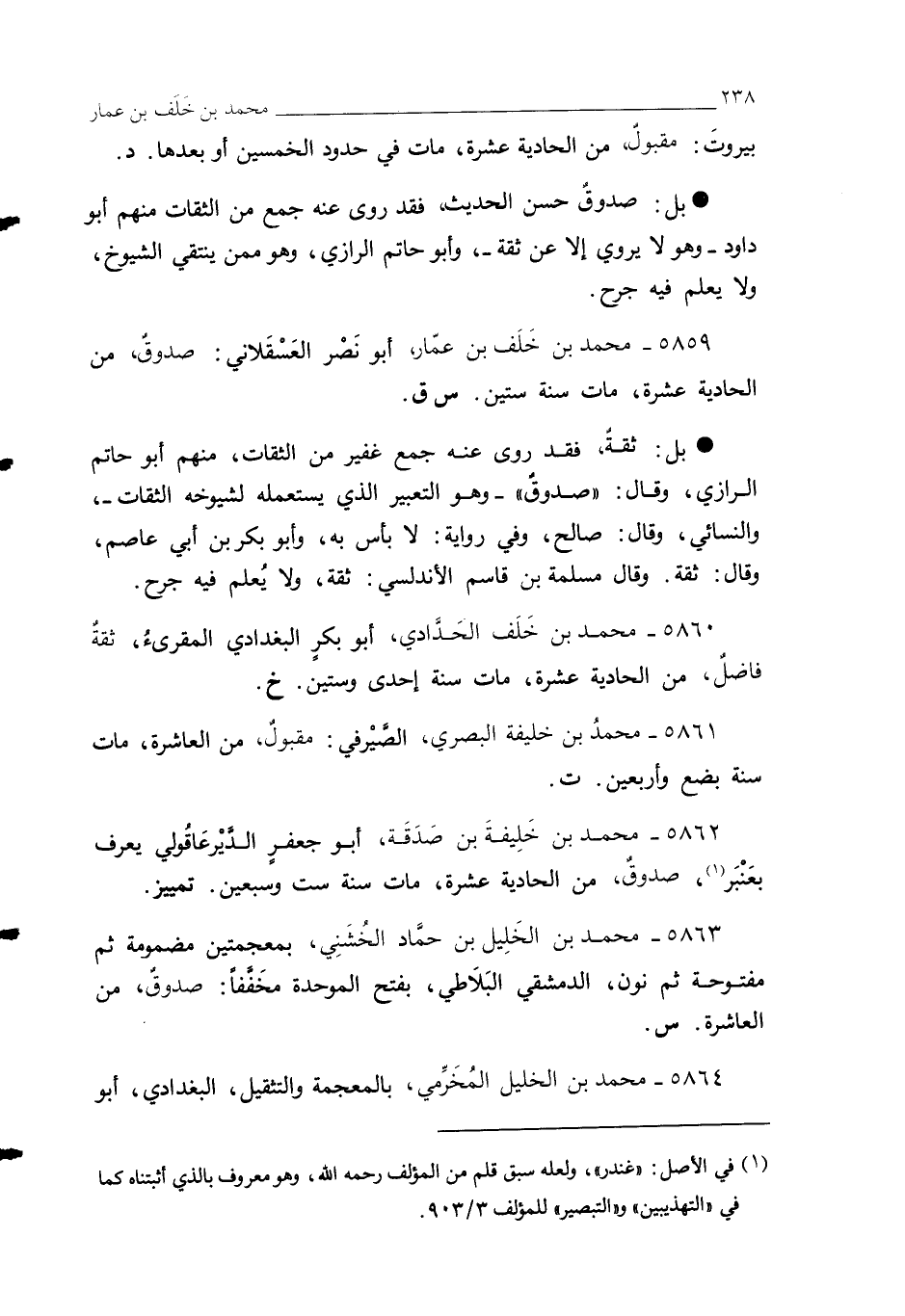 5860 - محمد بن خَلَف الحَدَّادي، أبو بكرٍ البغدادي المقرئُ، ثقةٌ فاضلٌ، من الحادية عشرة، مات سنة إحدى وستين. خ.