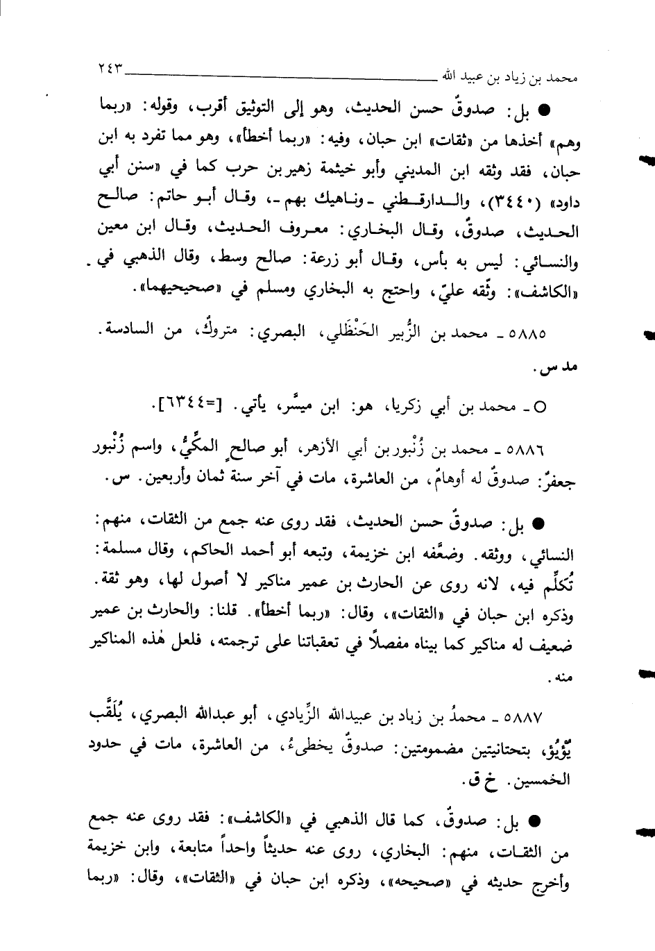 5887 - محمدُ بن زياد بن عبيد الله الزِّيادي، أبو عبد الله البصري، يُلَقَّب يُؤْيُؤ، بتحتانيتين مضمومتين: صدوقٌ يخطئُ، من العاشرة، مات في حدود الخمسين. خ ق.