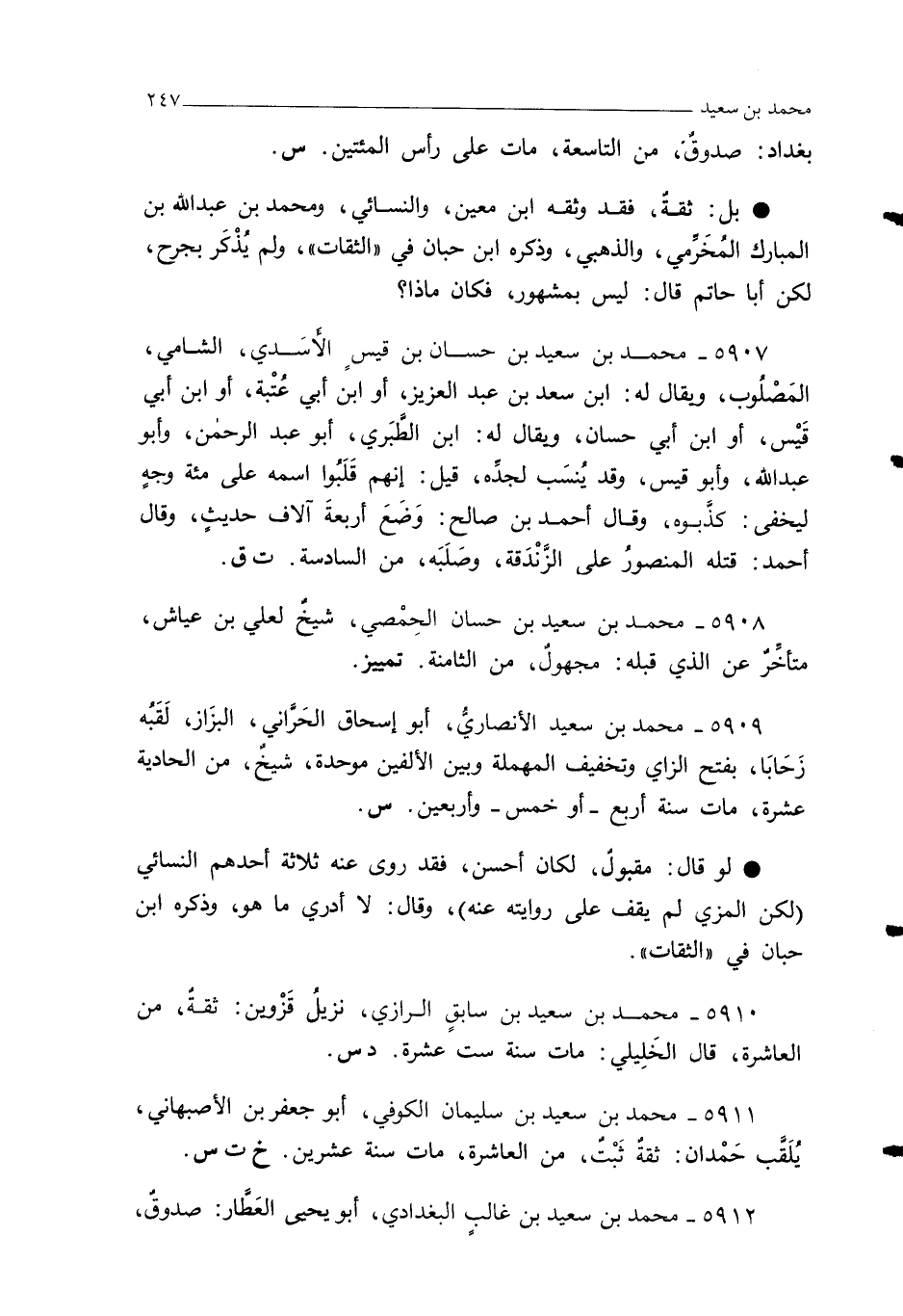 5910 - محمد بن سعيد بن سابقٍ الرازي، نزيلُ قَزْوين: ثقةٌ، من العاشرة، قال الخَلِيلي: مات سنة ست عشرة. دس.