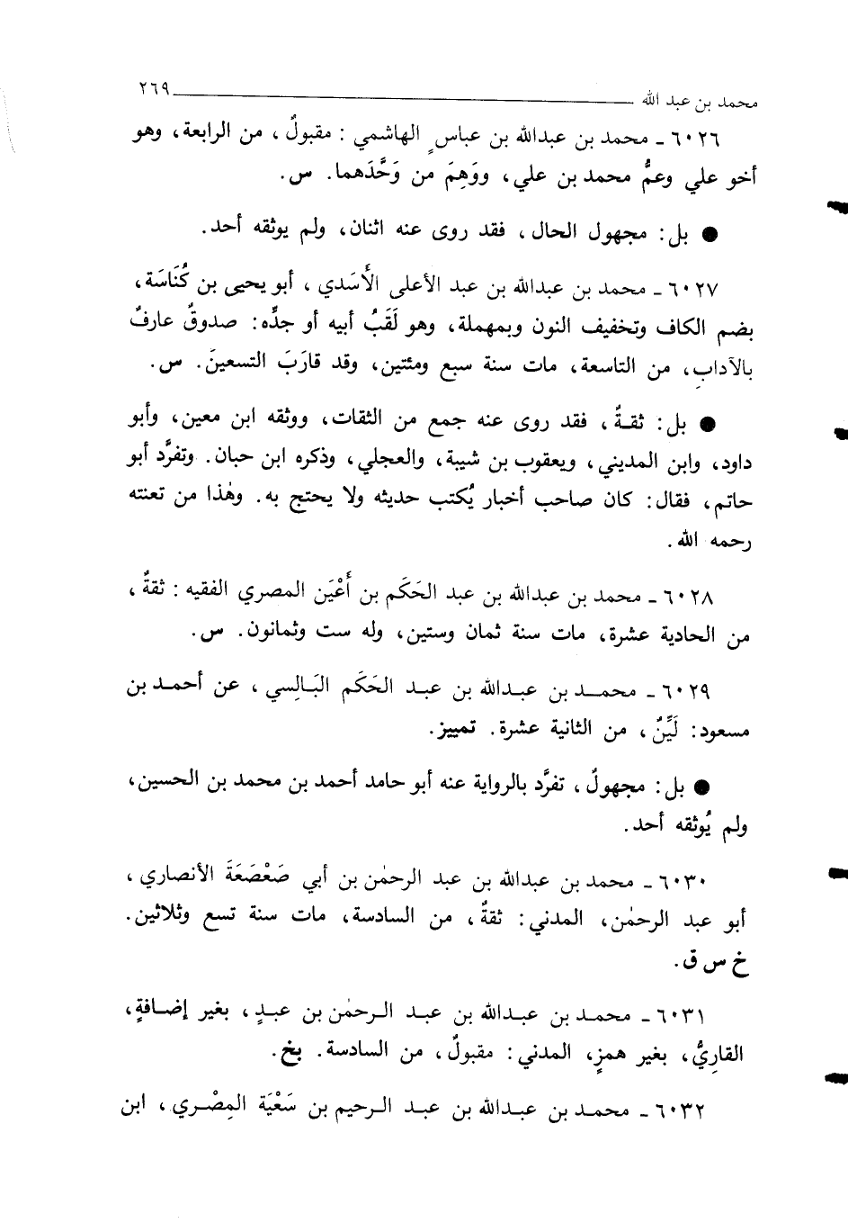 6026 - محمد بن عبد الله بن عباسٍ الهاشمي: مقبولٌ، من الرابعة، وهو أخو علي وعمُّ محمد بن علي، ووَهِمَ من وَحَّدَهما. س.