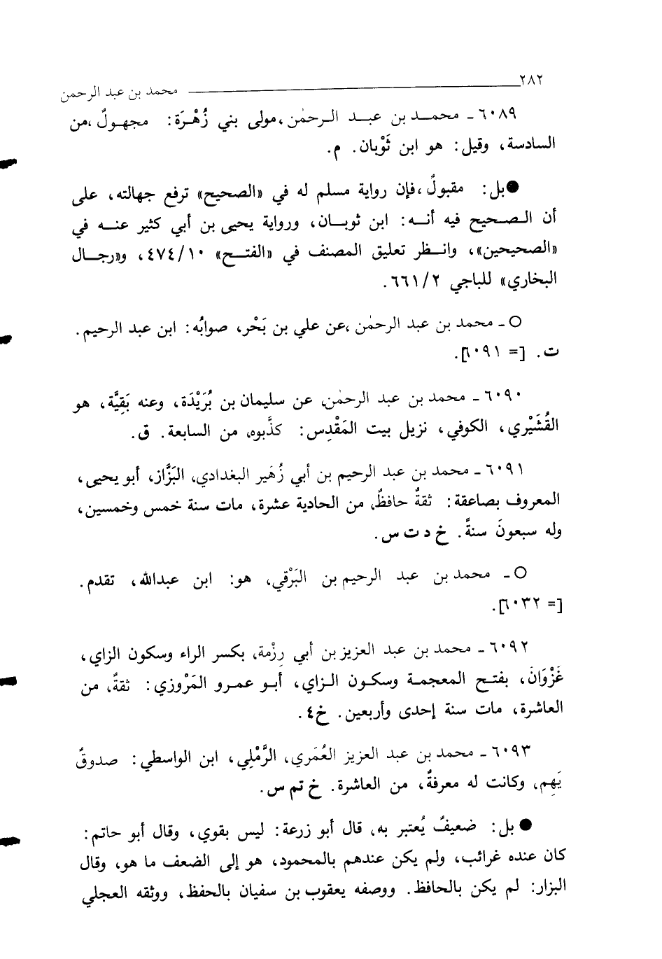 6089 - محمد بن عبد الرحمن، مولى بني زُهْرَة: مجهول، من السادسة، وقيل: هو ابن ثَوْبان. م.