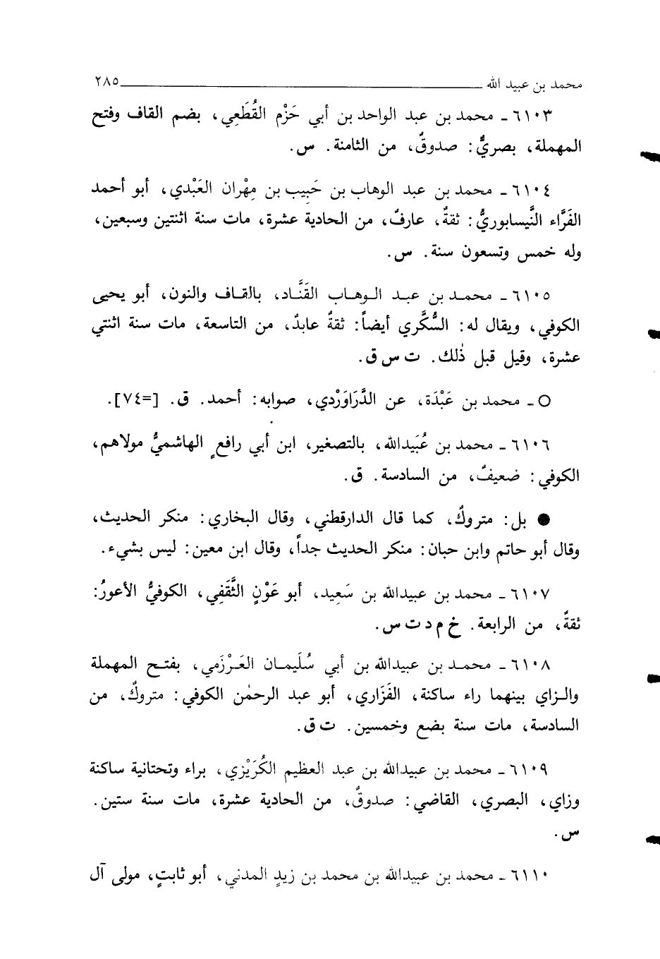 6105 - محمد بن عبد الوهاب القنَّاد، بالقاف والنون، أبو يحيى الكوفي، ويقال له: السُّكَّري أيضًا: ثقة عابدٌ، من التاسعة، مات سنة اثنتي عشرة، وقيل قبل ذلك. ت س ق.