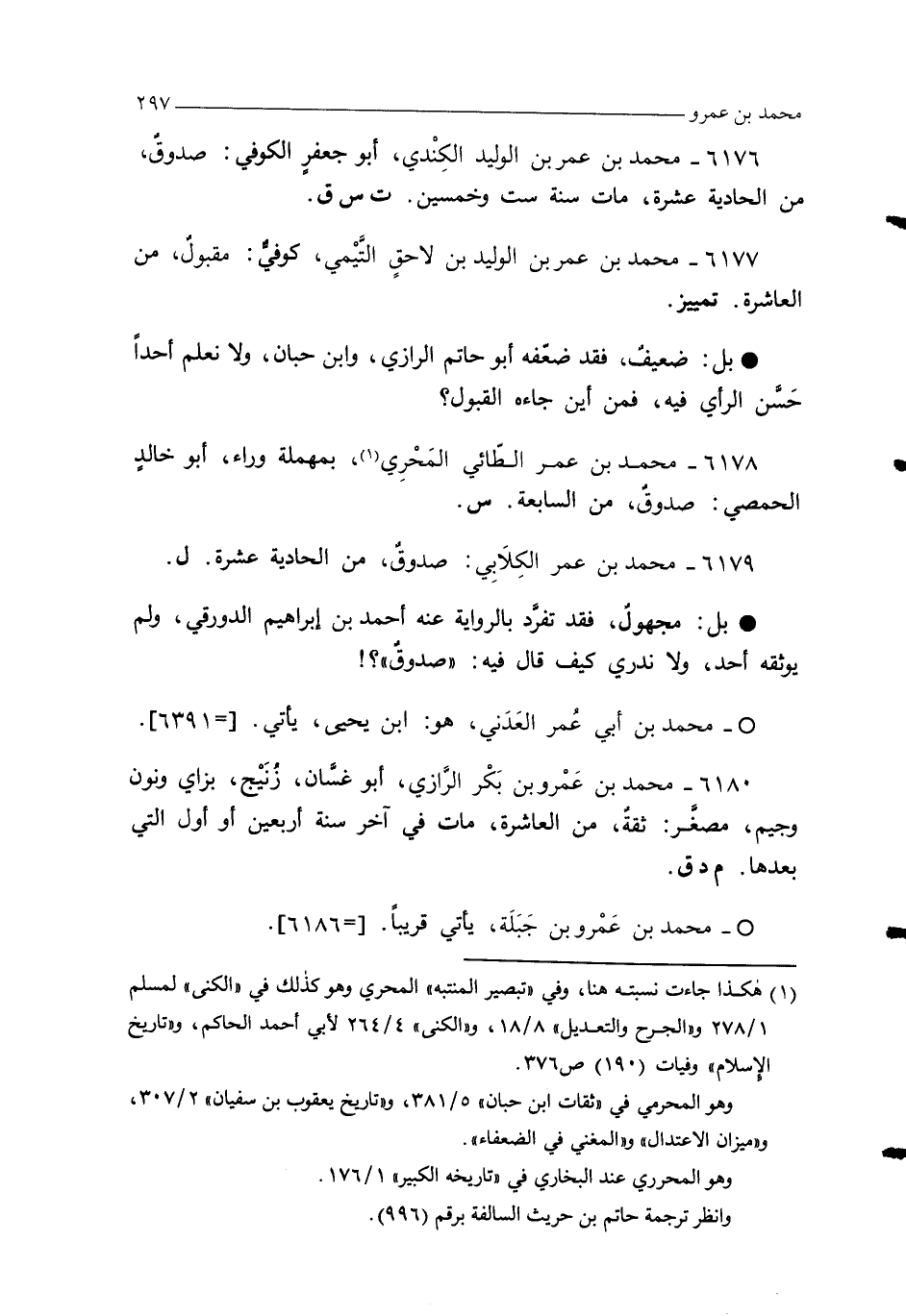6179 - محمد بن عمر الكِلَابِيُّ: صدوقٌ، من الحادية عشرة. ل.