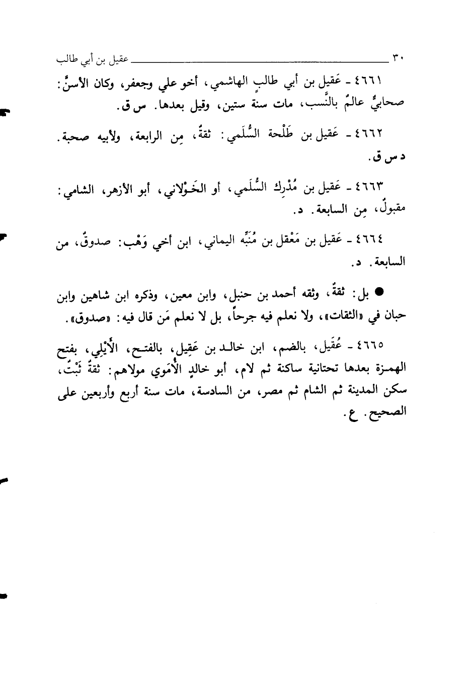 4661 - عَقيل بن أبي طالبٍ الهاشمي، أخو علي وجعفر، وكان الأسنَّ: صحابيٌّ عالمٌ بالنَّسب، مات سنة ستين، وقيل بعدها. س ق.
