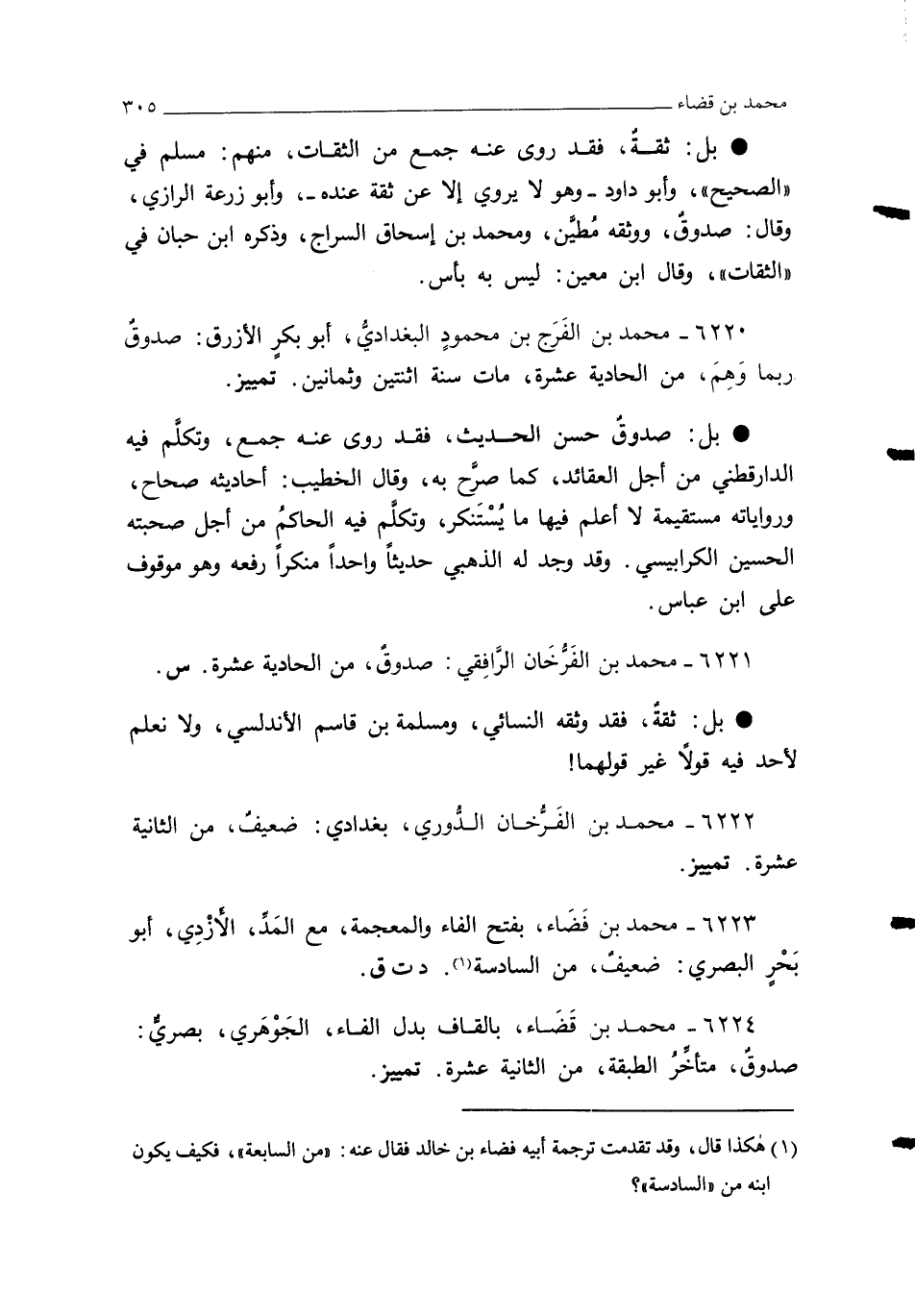 6222 - محمد بن الفَرُّخَان الدُّوريُّ، بغداديُّ: ضعيفٌ، من الثانية عشرة. تمييز.