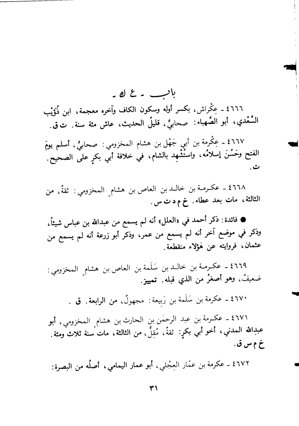 4669 - عكرمة بن خالد بن سَلَمة بن العاصم بن هشامٍ المخزومي: ضعيفٌ، وهو أصغرُ من الذي قبله. تمييز.