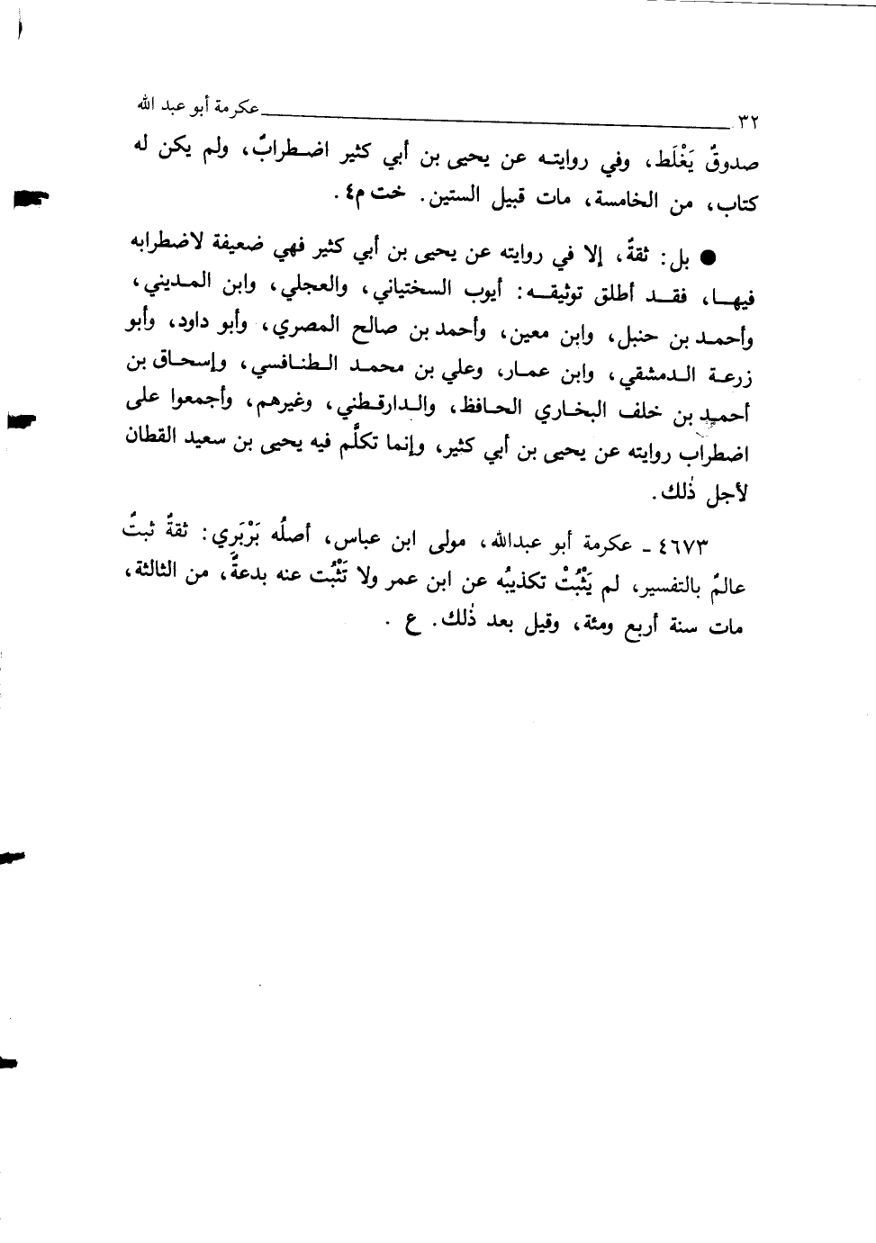 4673 - عكرمة أبو عبد الله، مولى ابن عباس، أصلُه بَرْبَري: ثقةٌ ثبتٌ عالمٌ بالتفسير، لم يَثْبُتْ تكذيبُه عن ابن عمر ولا تَثْبُت عنه بدعةٌ، من الثالثة، مات سنة أربع ومئة، وقيل بعد ذلك. ع.