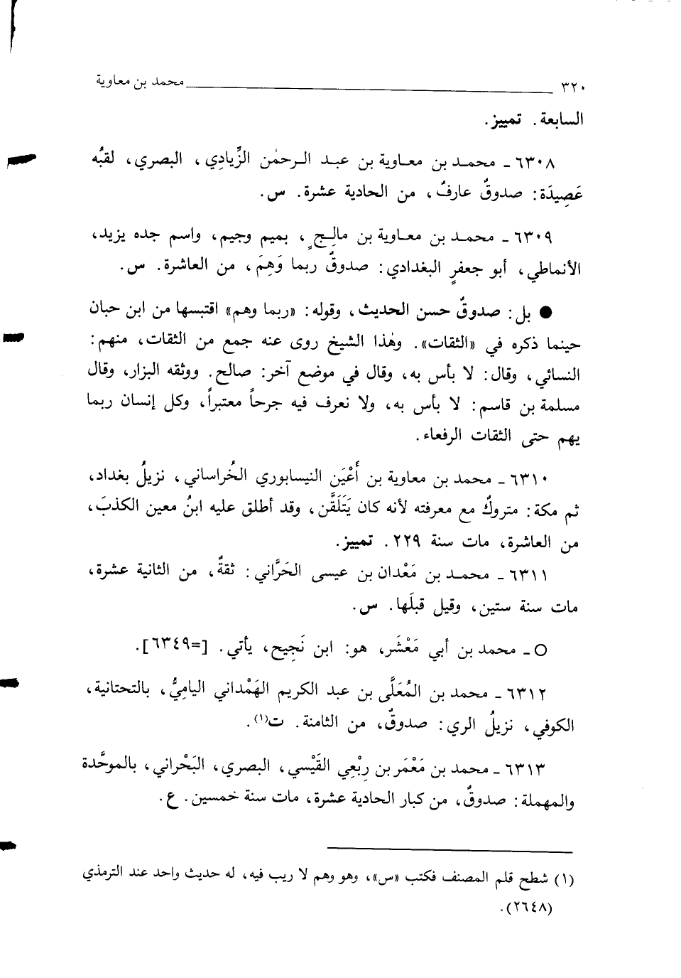 6308 - محمد بن معاوية بن عبد الرحمن الزِّيادِي، البصري، لقبُه عَصِيدَة: صدوقٌ عارفٌ، من الحادية عشرة. س.