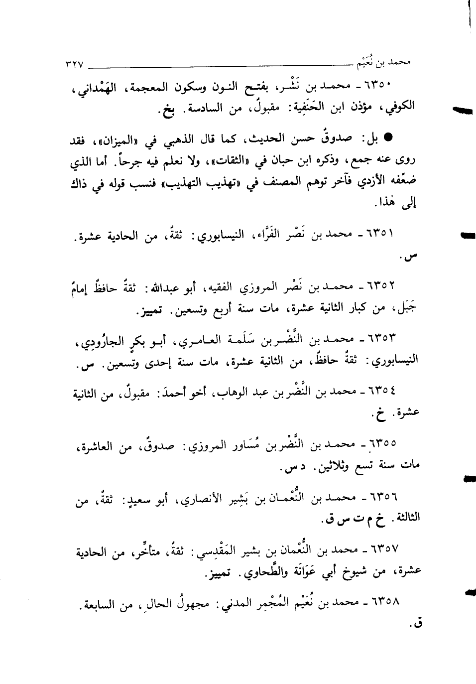 6352 - محمد بن نَصْر المروزي الفقيه، أبو عبد الله: ثقة حافظٌ إمامٌ جَبَل، من كبار الثانية عشرة، مات سنة أربع وتسعين. تمييز.