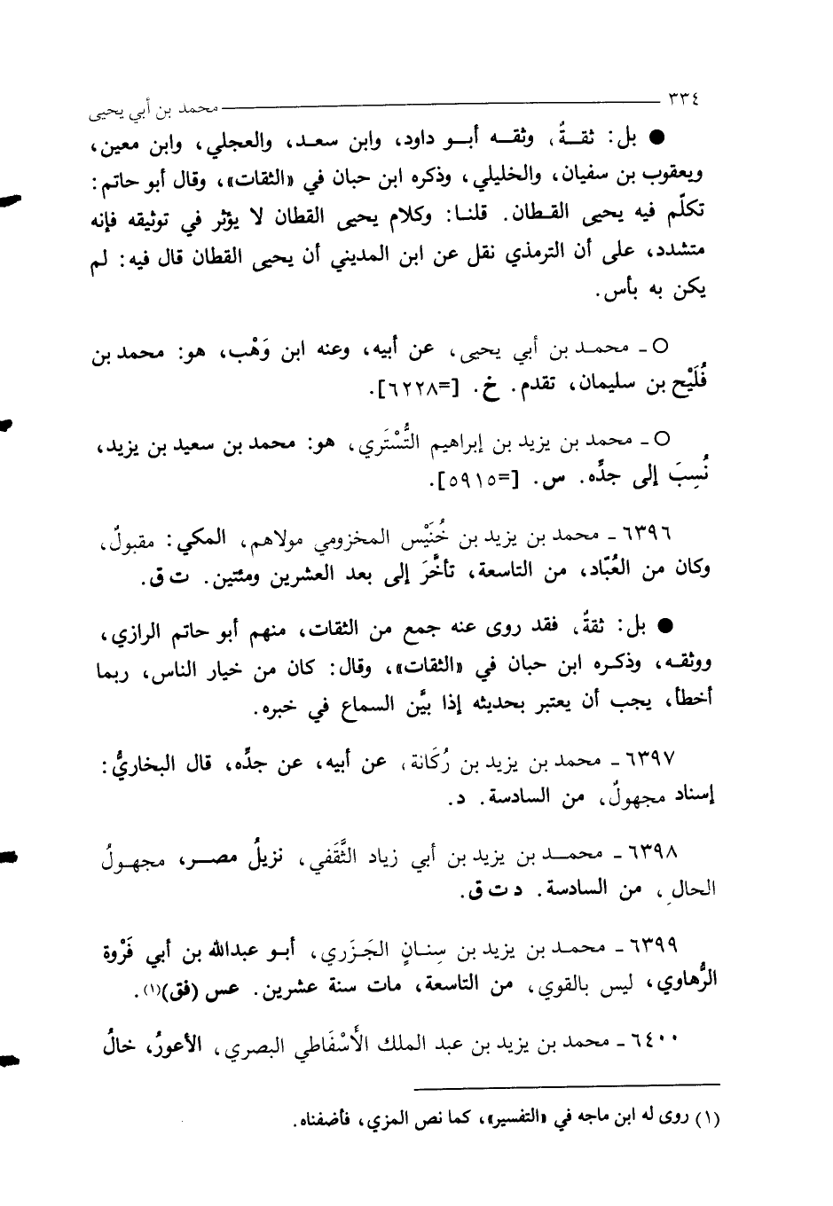 6396 - محمد بن يزيد بن خُنَيْس المخزومي مولاهم، المكي: مقبولٌ، وكان من العُبّاد، من التاسعة، تأخَّرَ إلى بعد العشرين ومئتين. ت ق.
