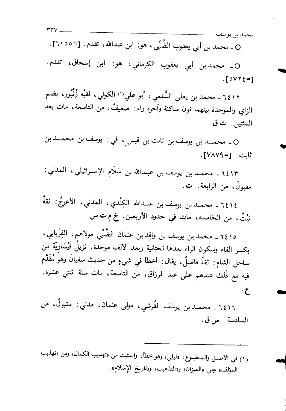 6414 - محمد بن يوسف بن عبد الله الكِنْدي، المدني، الأعرجُ: ثقةٌ ثَبْتٌ، من الخامسة، مات في حدود الأربعين. خ م ت س.
