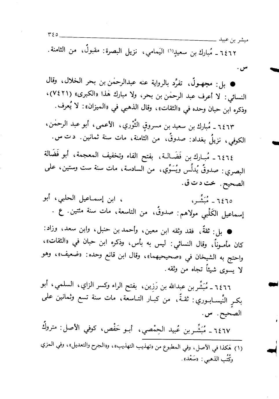 6463 - مُبارك بن سعيد بن مسروقٍ الثَّوْري، الأعمى، أبو عبد الرحمن، الكوفي، نزيلُ بغداد: صدوقٌ، من الثامنة، مات سنة ثمانين. د ت س.
