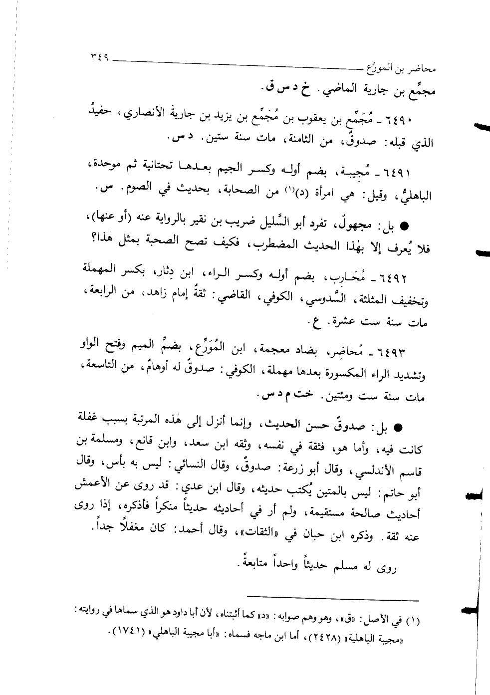 6493 - مُحاضِر، بضاد معجمة، ابن المُوَرِّع، بضمِّ الميم وفتح الواو وتشديد الراء المكسورة بعدها مهملة، الكوفي: صدوقٌ له أوهامٌ، من التاسعة، مات سنة ست ومئتين. خت م د س.