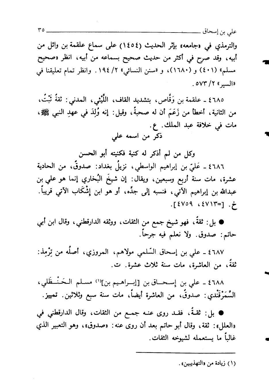 4687 - علي بن إسحاق السلمي مولاهم، المروزي، أصلُه من تِرْمِذ: ثقةٌ، من العاشرة، مات سنة ثلاث عشرة. ت.