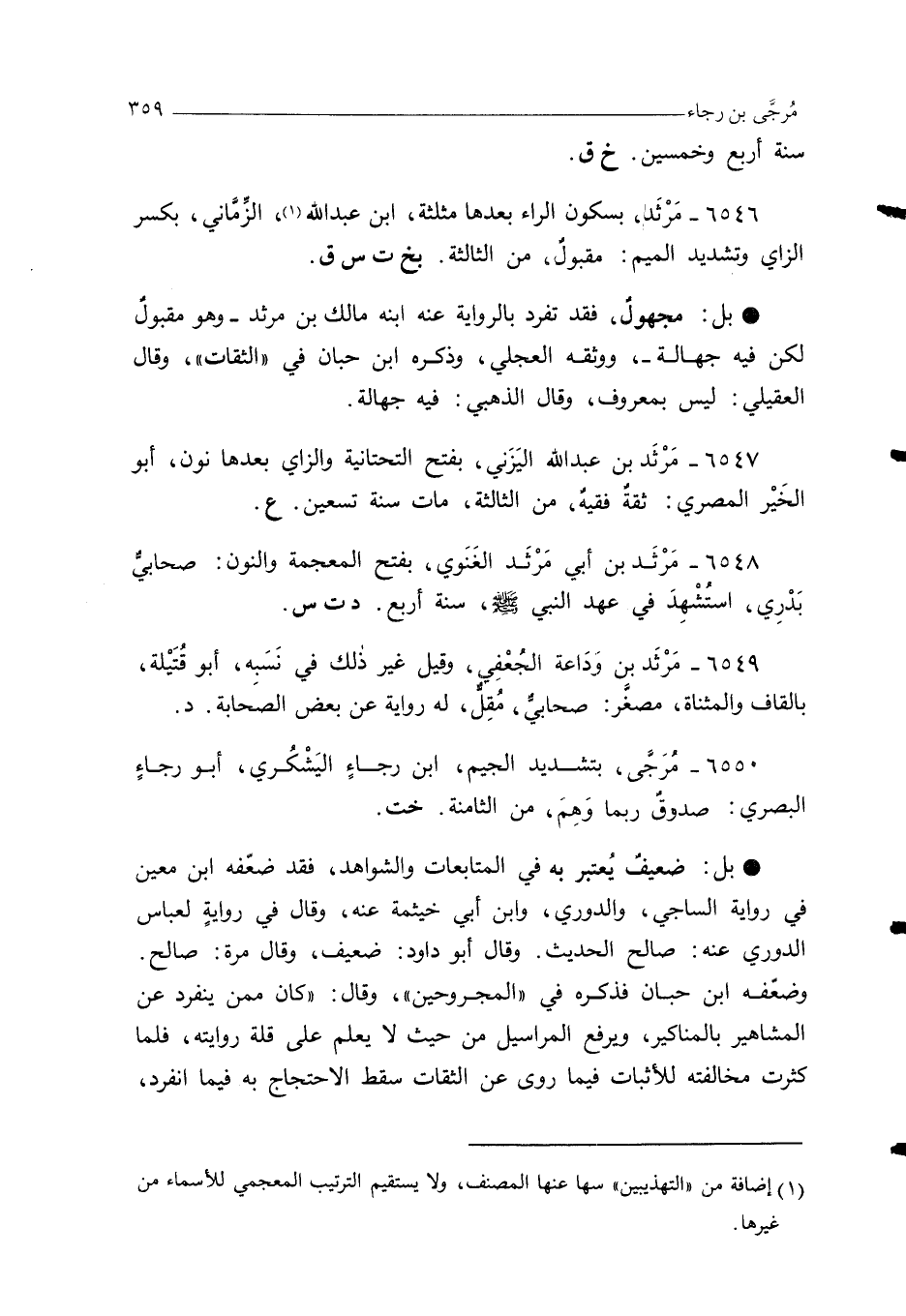 6546 - مَرْثَد، بسكون الراء بعدها مثلثة، ابنُ عبد الله (¬1)، الزَّمَّانيُّ، بكسر الزاي وتشديد الميم: مقبولٌ، من الثالثة. بخ ت س ق.