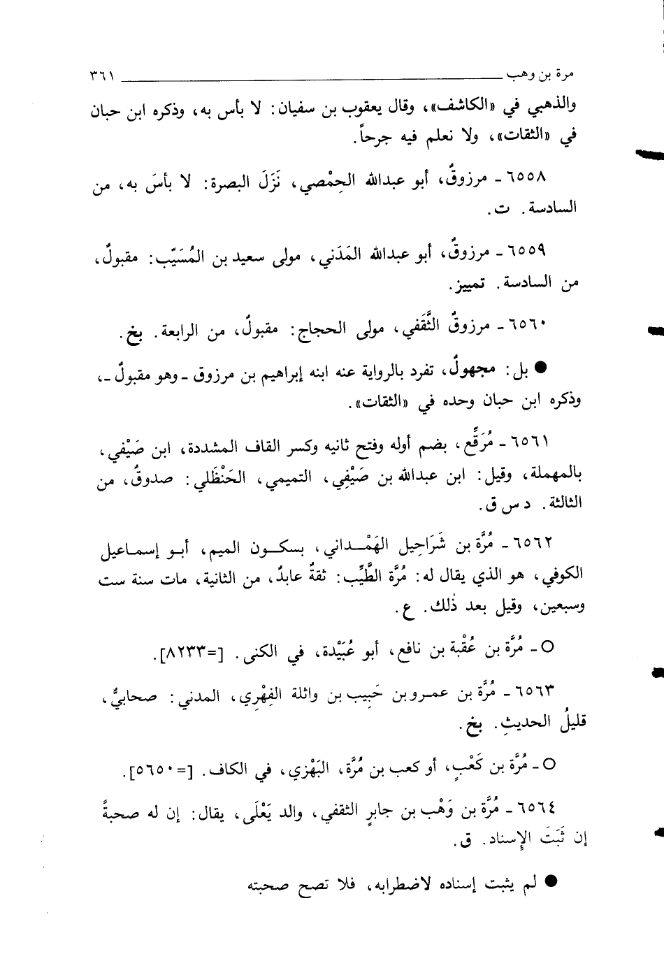 6559 - مرزوقٌ، أبو عبد الله المَدَنيُّ، مولى سعيد بن المُسَيِّب: مقبولٌ، من السادسة. تمييز.