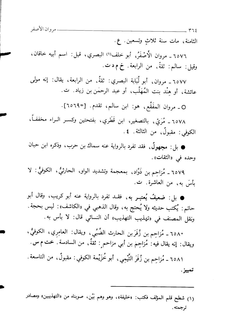 6576 - مروان الأصْفَرُ، أبو خلف (¬1) البصريُّ، قيل: اسم أبيه خاقان، وقيل: سالم: ثقةٌ، من الرابعة. خ م د ت.