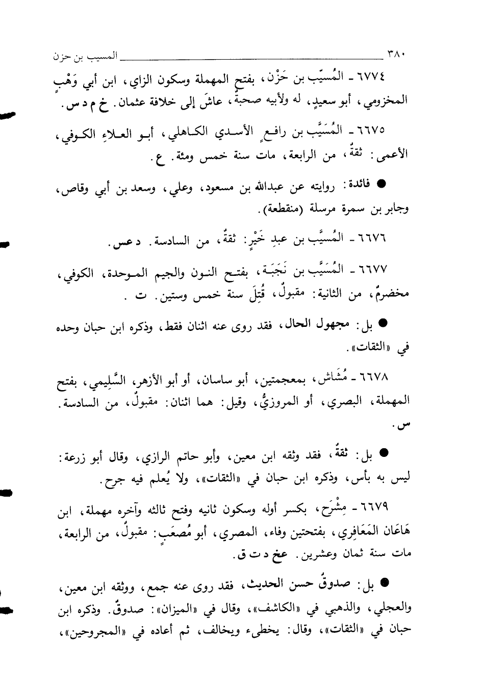 6675 - المُسَيَّب بن رافعٍ الأسدي الكاهلي، أبو العلاءِ الكوفي، الأعمى: ثقةٌ، من الرابعة، مات سنة خمس ومئة. ع.