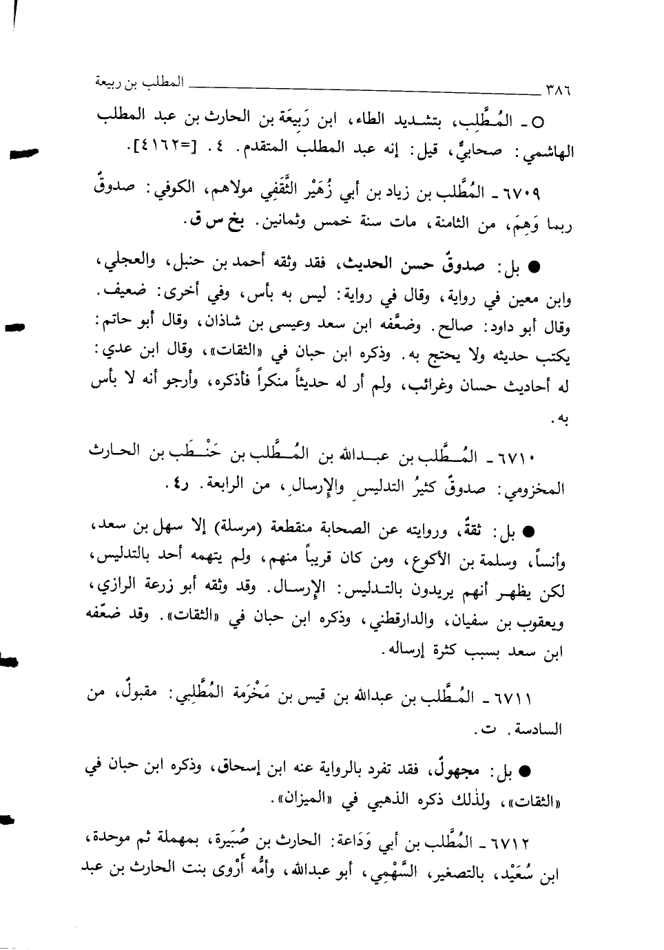 6710 - المُطَّلب بن عبد الله بن المُطَّلب بن حَنْطَب بن الحارث المخزومي: صدوقٌ كثير التدليسِ والإِرسالِ، من الرابعة. ر 4.