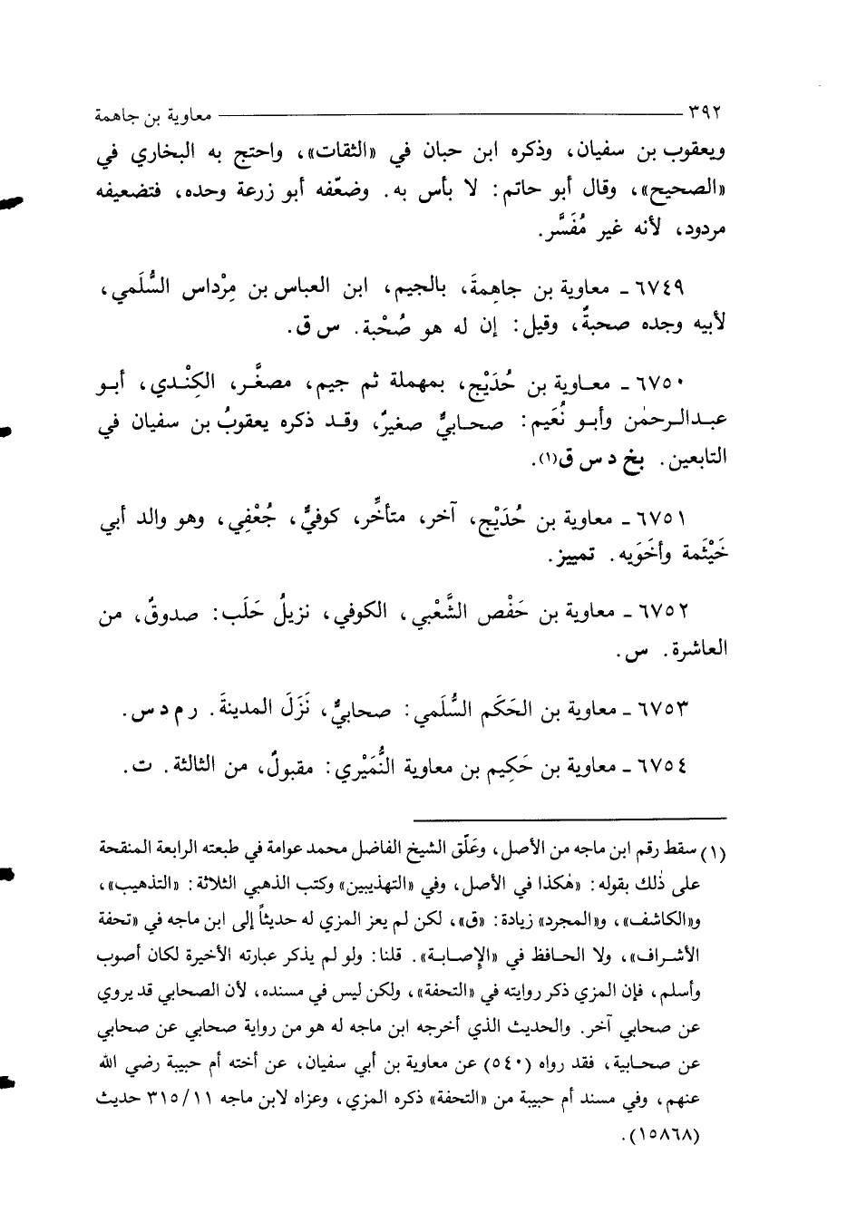 6751 - معاوية بن حُدَيْج، آخر، متأخِّر، كوفي، جُعْفِي، وهو والد أبي خَيْثَمة وأخَوَيه. تمييز.