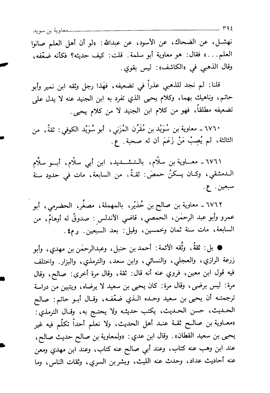 6762 - معاوية بن صالح بن حُدَيْر، بالمهملة، مصغَّر، الحضرمي، أبو عمرو وأبو عبد الرحمن، الحمصي، قاضي الأندلسِ: صدوقٌ له أوهامٌ، من السابعة، مات سنة ثمان وخمسين، وقيل: بعد السبعين. ر م 4.